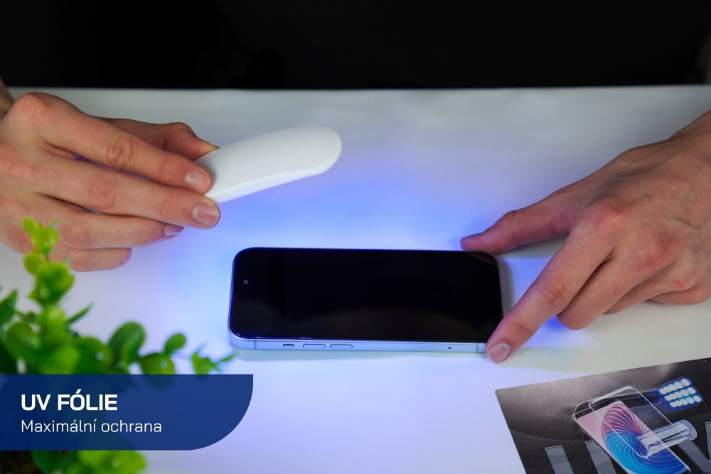 - Perfektně přilne díky UV gelu – po nasvícení UV lampou (je součástí balení) gel na fólii ztvrdne, což zajistí ještě vyšší ochranu displeje.